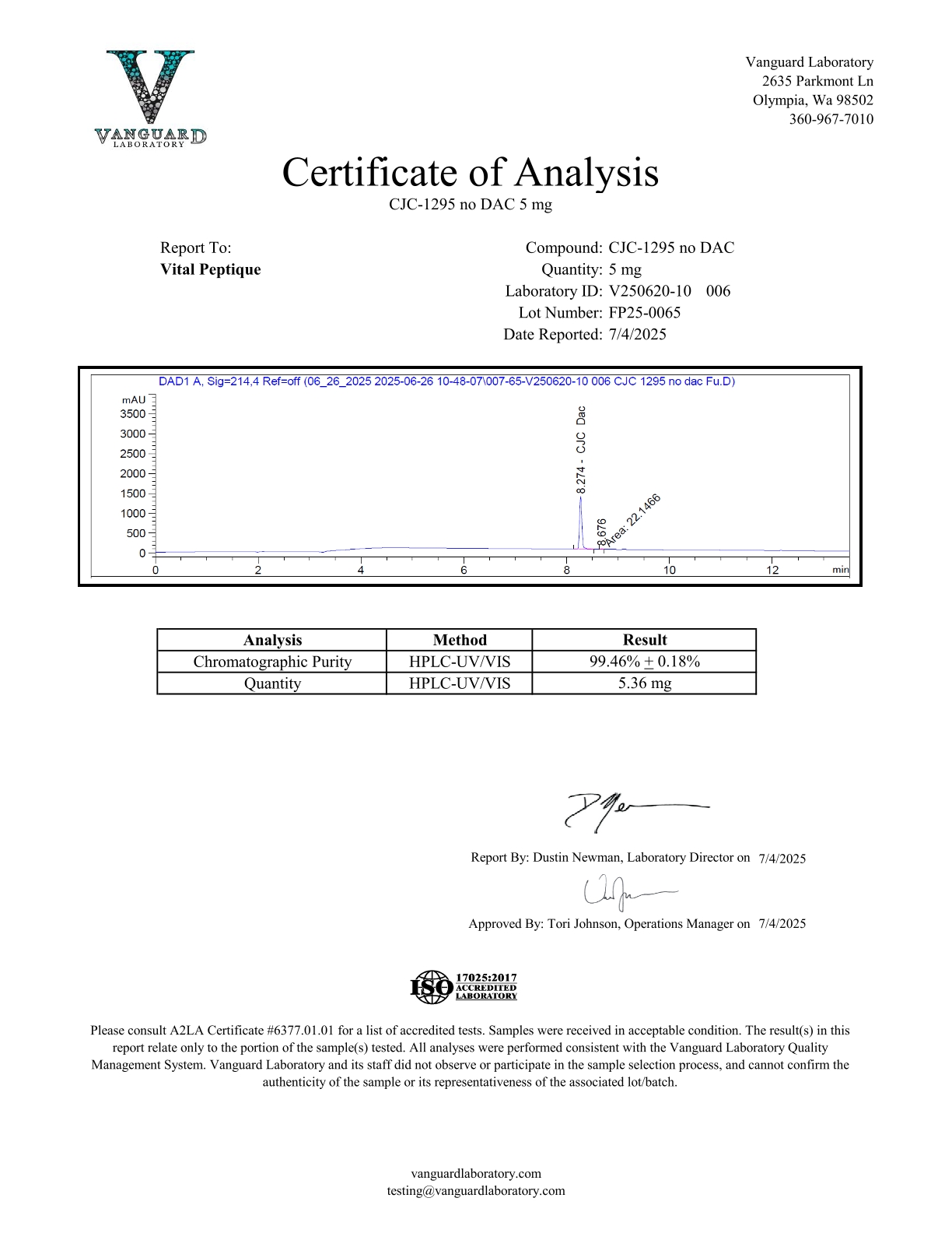 Moreover, every vial of CJC-1295 No DACÂ peptide will come with a safety-sealed top (NOTE – the cap colors may vary depending on the formula). Finally, the rubber stopper will be exposed once the top is freed from the lid. Vital Peptique cares about the most accurate result of your research which is why we never compromise with the quality of our peptides.