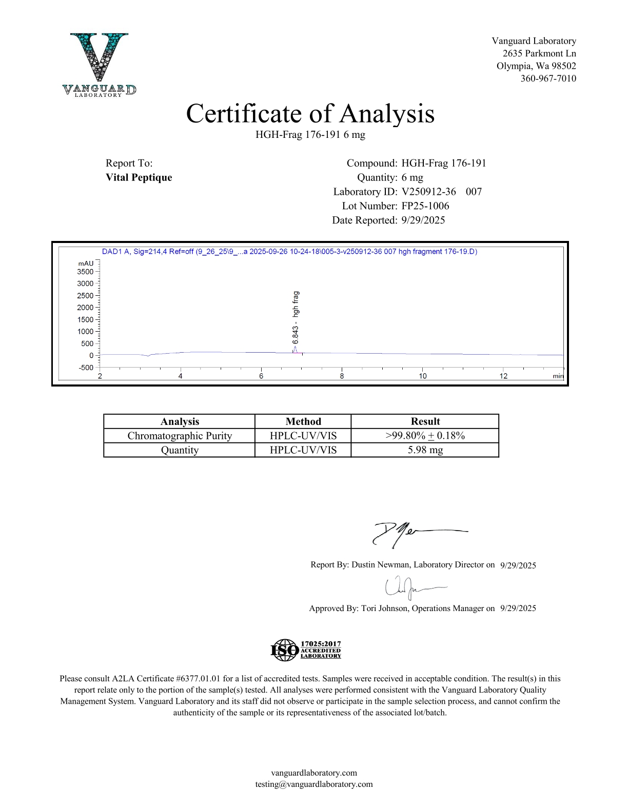 Please be aware that all peptides at Vital Peptique are meant ONLY for research purposes. They should not be used for any other purpose. Please familiarize yourself with our Terms and Conditions before ordering. Vital Peptique cares about transparency above all. Buy hGH Frag 176-191 from Vital Peptique now!