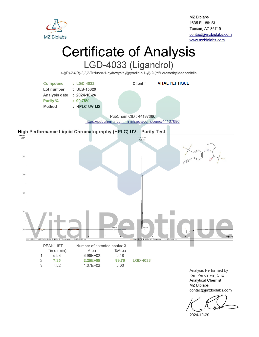 LGD-4033 is sold for research purposes only. This compound is not approved for human consumption. Proper laboratory handling procedures and regulatory compliance are the sole responsibility of the researcher.