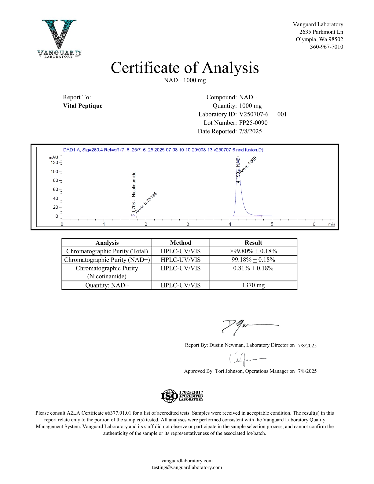 At Vital Peptique, each batch of NAD⁺ is carefully reviewed to ensure proper lyophilization, vial integrity, and consistent presentation. The compound is supplied as a dry, lyophilized powder within a 10 mL vial, sealed to preserve material integrity from the point of laboratory packaging.