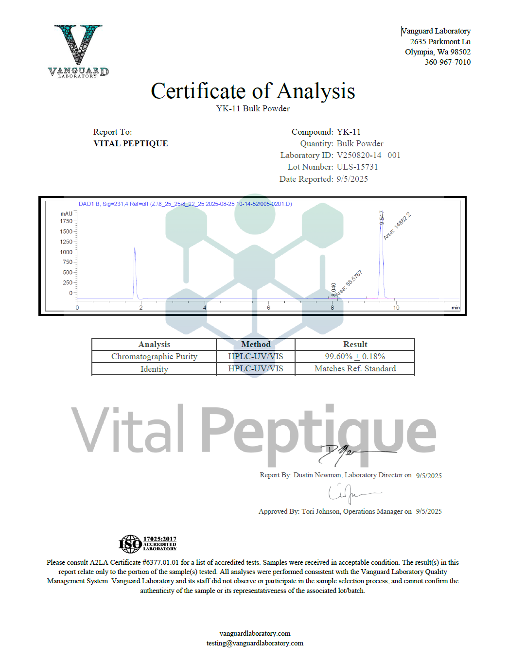 At Vital Peptique, every batch of YK-11 undergoes internal review to ensure proper encapsulation, secure sealing, and consistent presentation. Our focus is on delivering materials that meet rigorous quality expectations so researchers can maintain confidence in the integrity of their work.